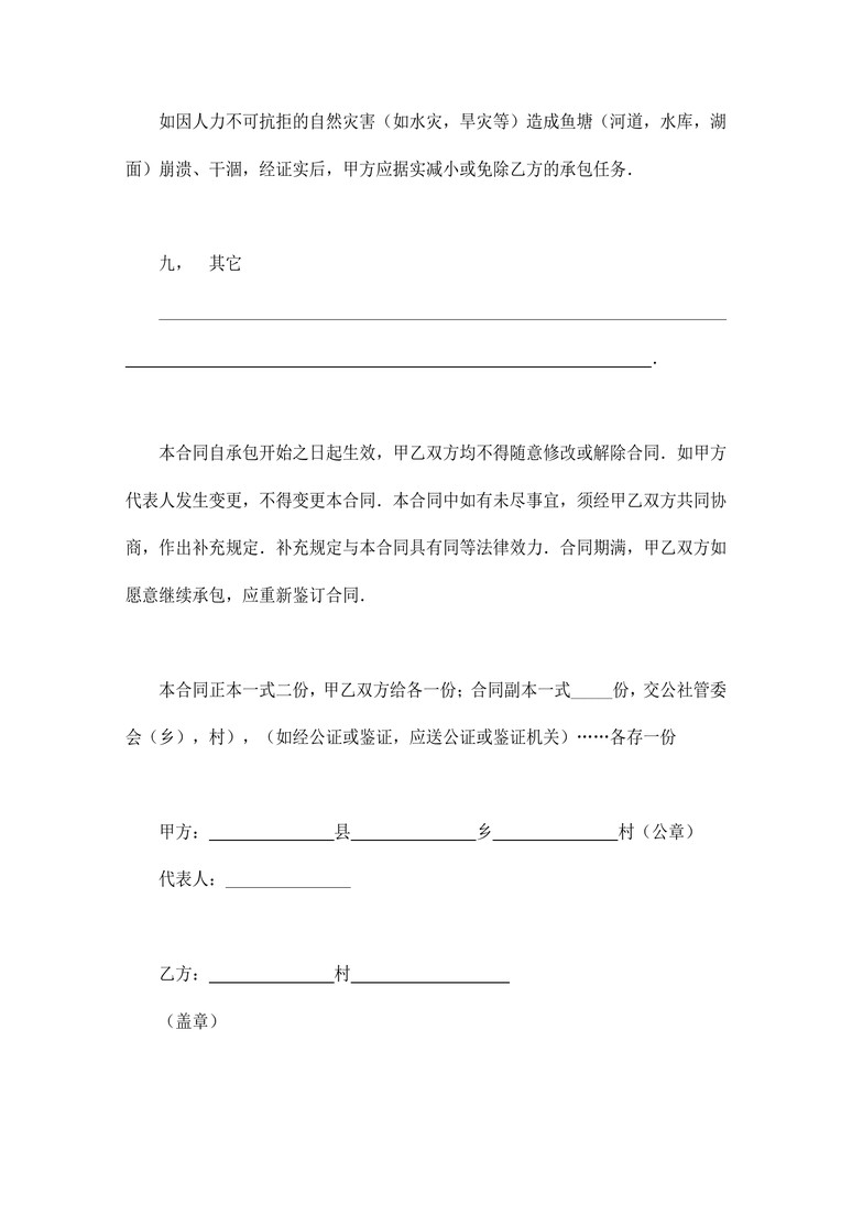 本作品内容为 合同协议_承包合同书(渔业2)合同协议word模板,请使用 word软件 打开,作品中的文字与图均可以修改和编辑,图片更改请在作品中右键图片并更换,文字修改请直接点击文字进行修改,也可以新增和删除作品中的内容。
