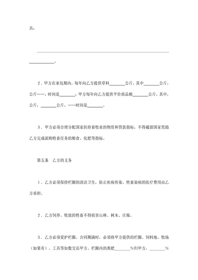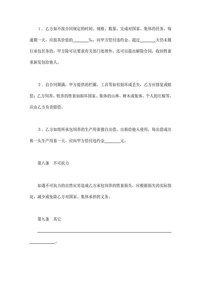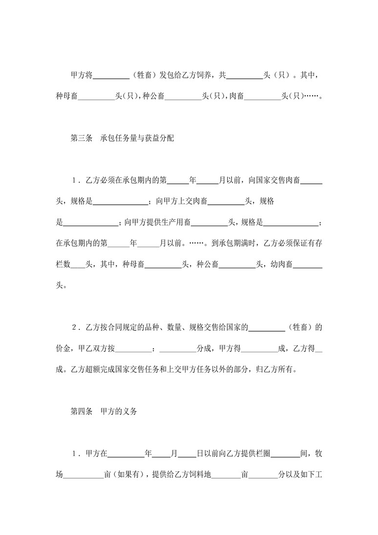 本作品内容为 合同协议_承包合同书(畜牧1)合同协议word模板,请使用 word软件 打开,作品中的文字与图均可以修改和编辑,图片更改请在作品中右键图片并更换,文字修改请直接点击文字进行修改,也可以新增和删除作品中的内容。
