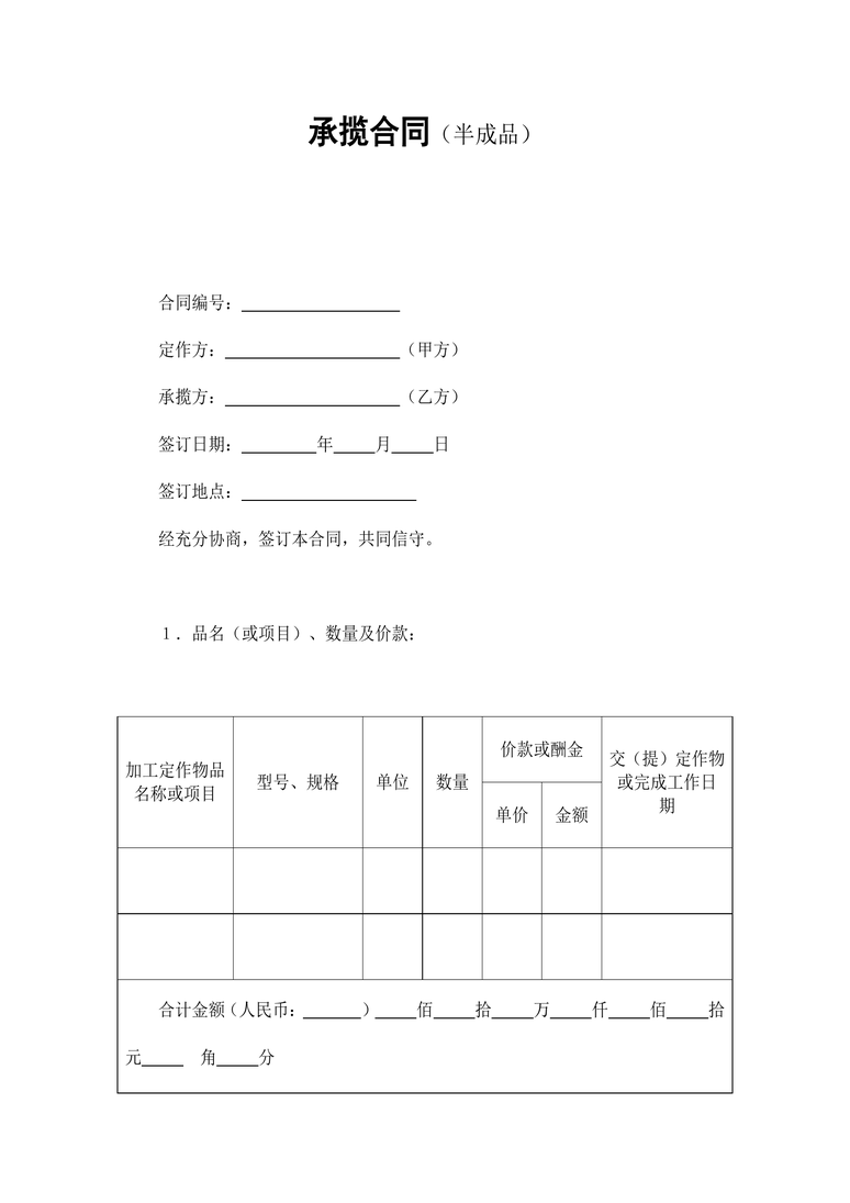 合同协议_承揽合同(半成品)合同协议word模板是二三办公网精美打造的合同协议Word通用模板,可以满足您在制作合同协议Word文档时的各种需求,二三办公网是专注生产高质量Word模板的网站,您不但可以下载合同协议_承揽合同(半成品)合同协议word模板,更有大量的不同场景,不同风格的合同协议Word模板可供下载使用。