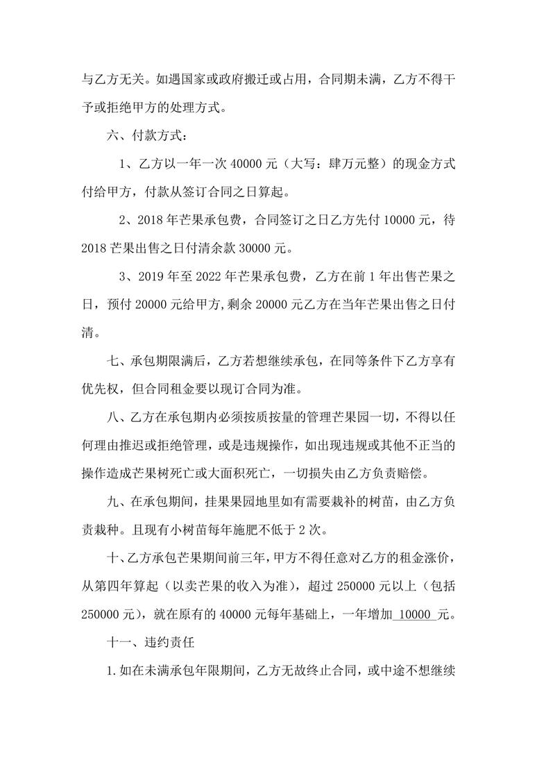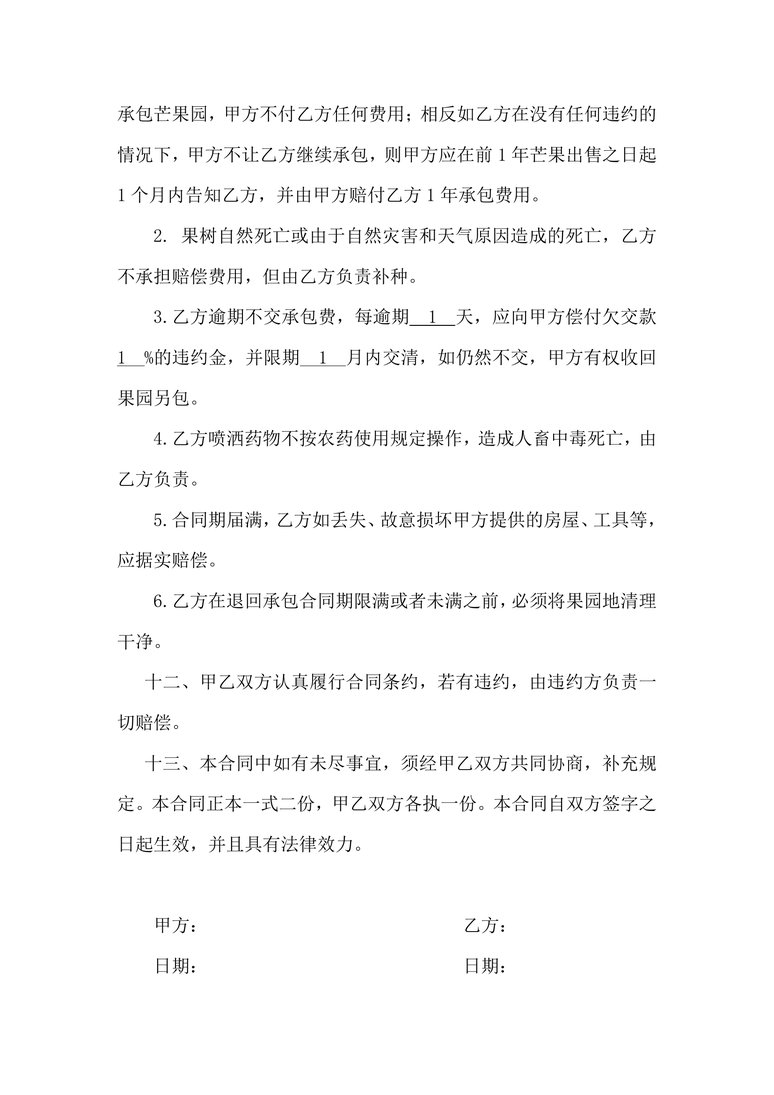 本作品内容为 合同协议_芒果园承包合同合同协议word模板,请使用 word软件 打开,作品中的文字与图均可以修改和编辑,图片更改请在作品中右键图片并更换,文字修改请直接点击文字进行修改,也可以新增和删除作品中的内容。