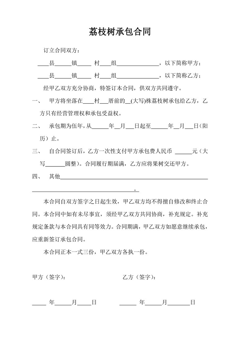 合同协议_荔枝树承包合同范本合同协议word模板是二三办公网精美打造的合同协议Word通用模板,可以满足您在制作合同协议Word文档时的各种需求,二三办公网是专注生产高质量Word模板的网站,您不但可以下载合同协议_荔枝树承包合同范本合同协议word模板,更有大量的不同场景,不同风格的合同协议Word模板可供下载使用。